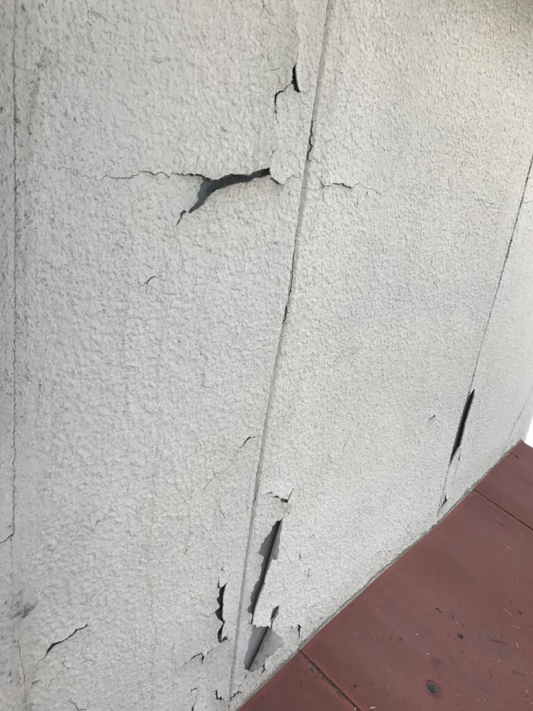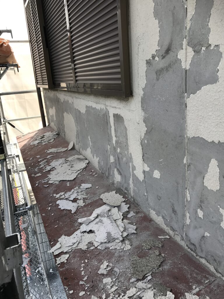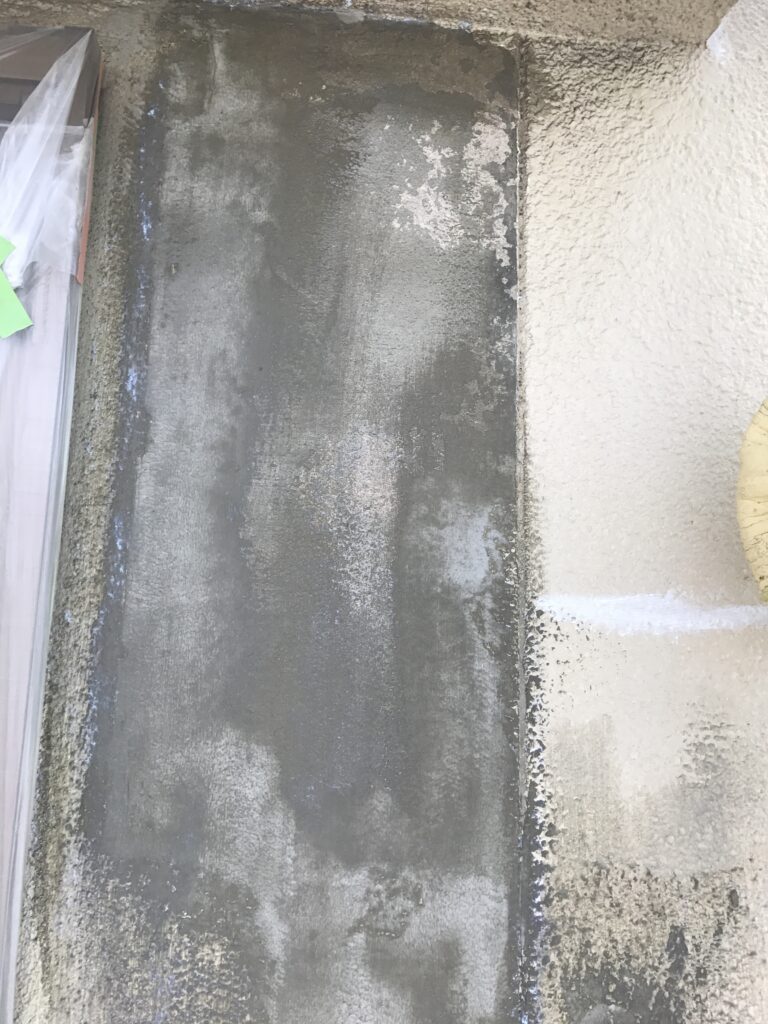 剥がした所としっかり密着している塗膜との段差をなくすためにモルタル系フィラーで補修した後、密着材を塗布します。