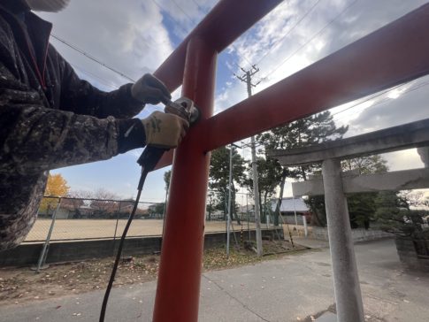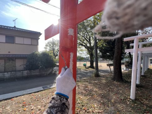 代表ブログこんばんは!塗道元の髙橋です。 本日は鳥居塗装工事の続きをしました。 朝はポカポカして暖かかったですがお昼からは肌寒かったですね。 中塗り施工中 それでは日々ご信頼いただいているお客様に感謝して! 本日もお疲れ様でした。